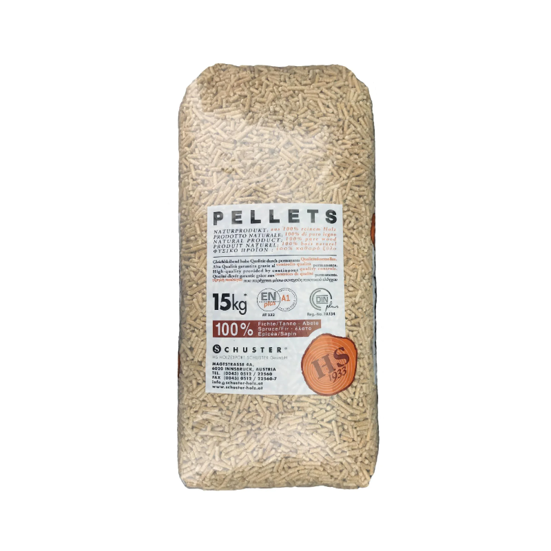 L‘homogénéité des granulés assure une combustion uniforme avec une pollution minimale. De ce fait, les granulés sont une source d’énergie respectant l’environnement et contribuant à la réduction de l’effet de serre. Les centres peuvent être utilisés comme engrais organique. Le pellet SCHÜSTER est fabriqué à partir de bois 100% épicéa/sapin conforme aux normes DIN Plus/EN Plus A1/PEFC et sont certifiés EN PLUS A1 et DIN+
